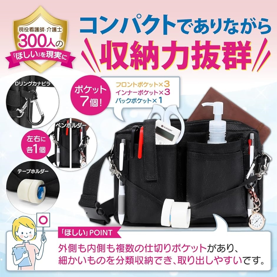 「大容量:コンパクトなのに収納力抜群」:コンパクトなデザインでありながら、ファスナーポケット3つ、インナーポケット4つ、バックポケット1つを備え、多くのナースグッズを収納できます。