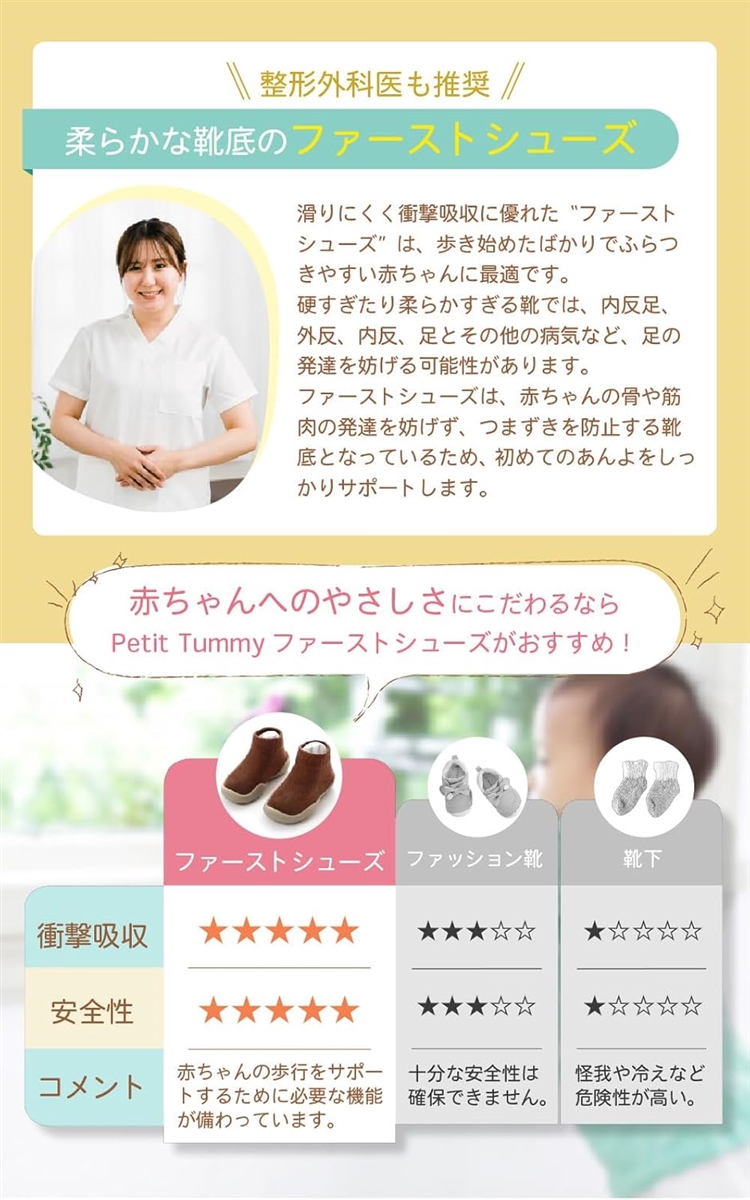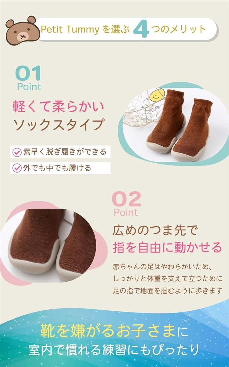 *「 安全性 」軽くて柔らかいからファーストシューズに選ばれる履きやすさ。靴を履くのを嫌がる赤ちゃんでも履きやすいソックスシューズです。