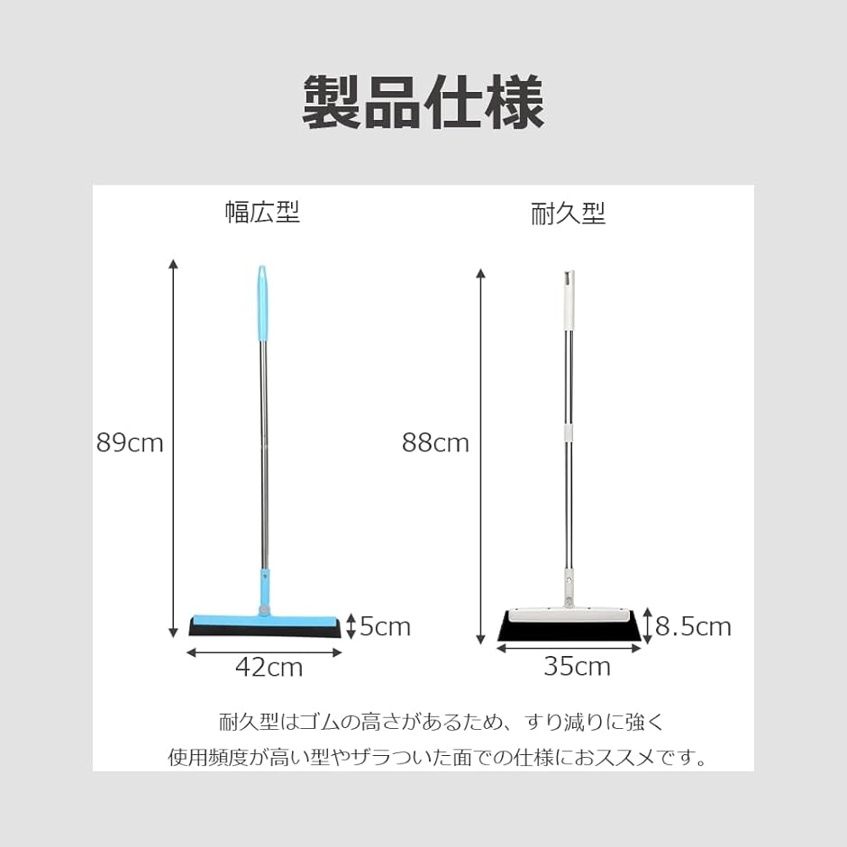 「製品仕様」幅広型:全長89cm 幅42cm先端の幅5cm 耐久型:全長88cm 幅35cm 先端の幅8.5cm スクイジーの素材:EVAフォーム