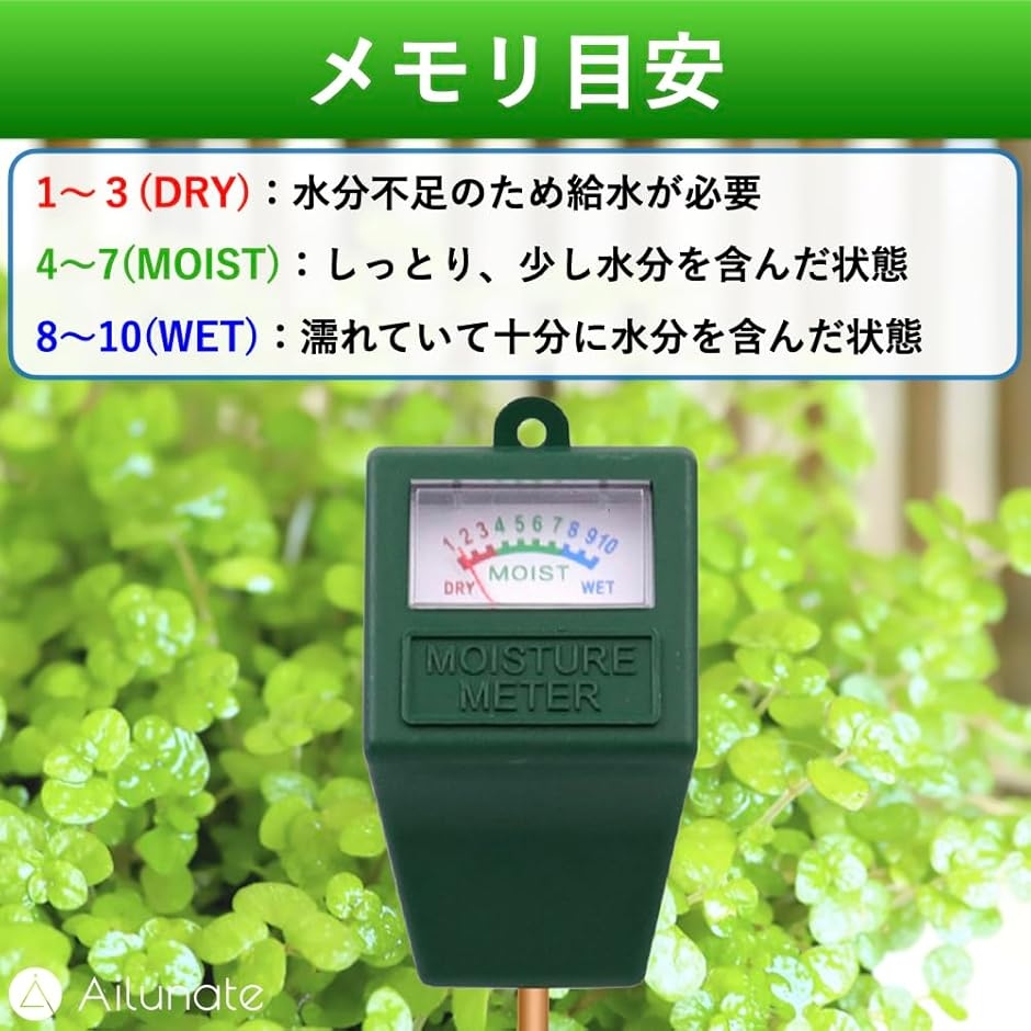 「メーターの目安」1〜3:散水が必要(ドライ)、4〜7:しっとり(モイスト)、8〜10:湿潤(ウェット)