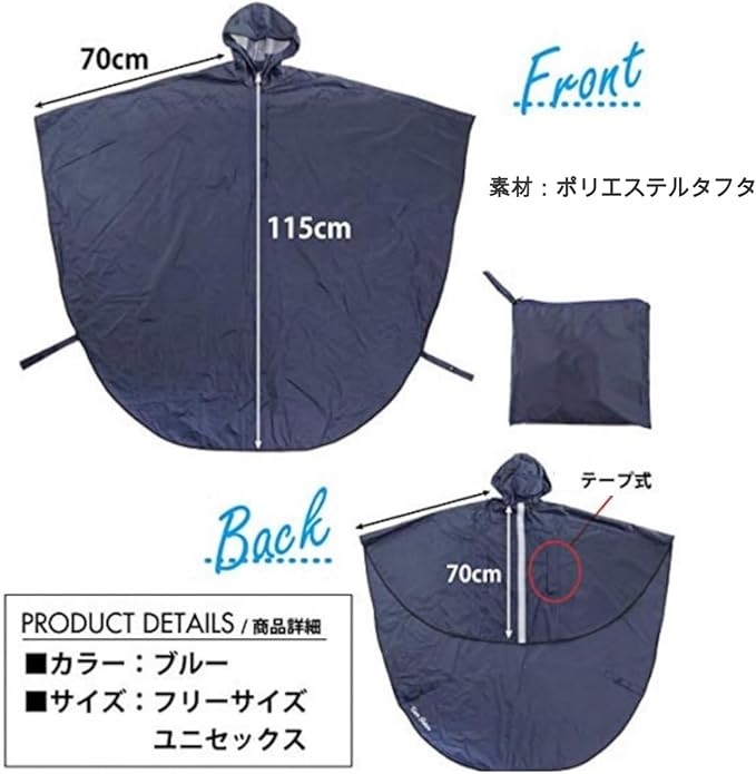 車椅子に座った状態のまま、上から被るだけの着脱容易なポンチョ型レインコートです。