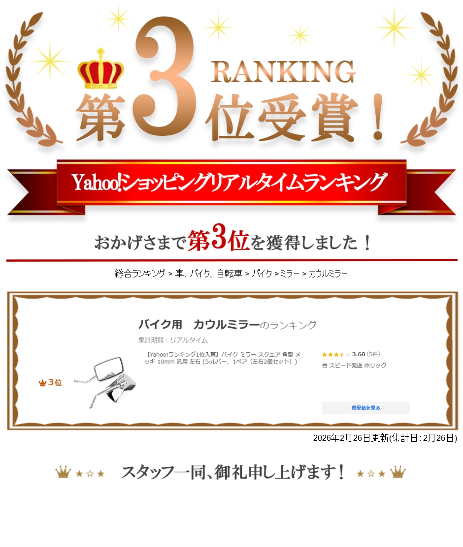 「サイズ」ミラー部分:縦7cmx横13cm、「ネジ規格」M10正ネジ(10mm))、「重量」約600g/個、「素材」クロームメッキ 「バリエーション」左右2個セットと左右2個セットx2(合計4個)の2種類よりお選びいただけます。