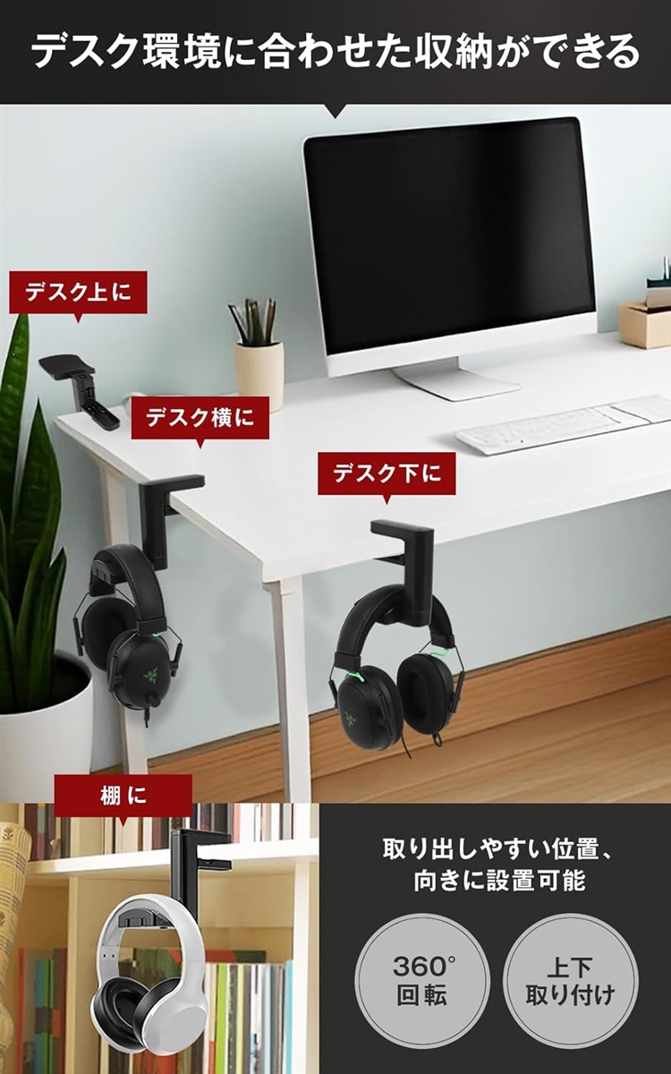 デスクや棚にワンタッチで取り付けられるこのヘッドホンフックは、360度の回転機能を備えています。