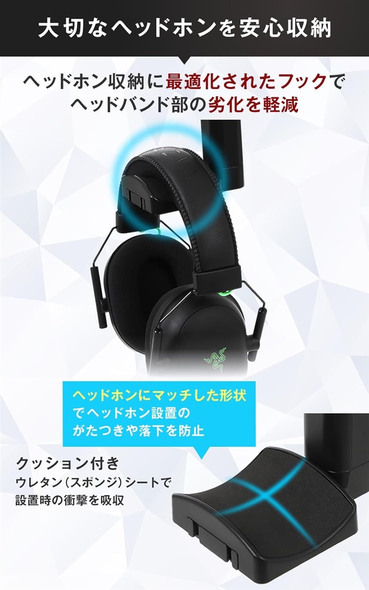 フック形状はヘッドホンに特化しており、ヘッドバンドを傷つけることなく安定して掛けられるようにウレタンクッションが付属しています。