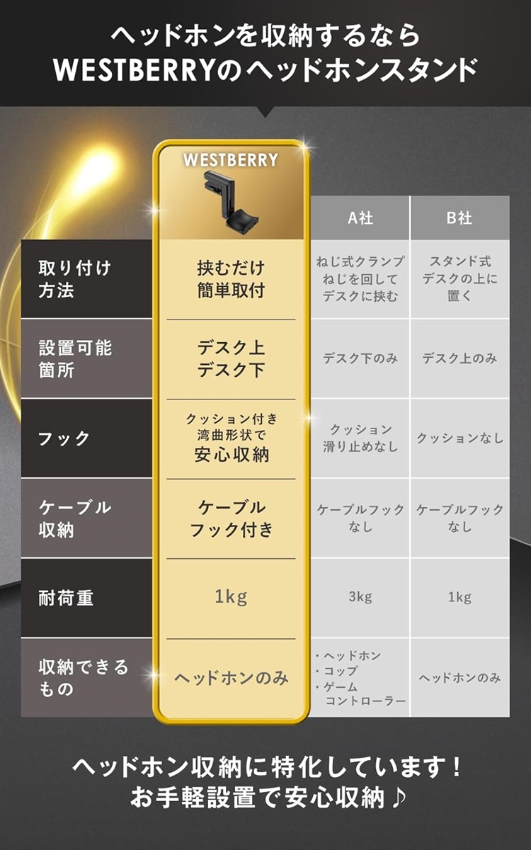 ヘッドセットはサッと掛けて収納・取り出し可能で、快適なデスク環境を実現します。