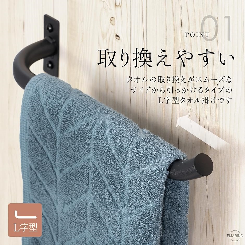 「タオルを取り換えやすい」デザイン性だけでなく、使いやすさにもこだわり設計されたL字型タイプは、両サイドを固定するタオル掛けと違い、サイドからサッと引っかけるだけのストレスフリー仕様がポイントです。
