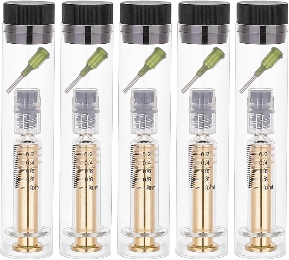数量&サイズ:ルアーロック&ブラントチップ付きガラス分注シリンジ5セット入り;サイズ:直径約20mm、長さ91mm、内径19mm、容量:1ml、ルアー:約62x17.5mm、先端:約30x7mm、内径4mm、穴:1.5mm。