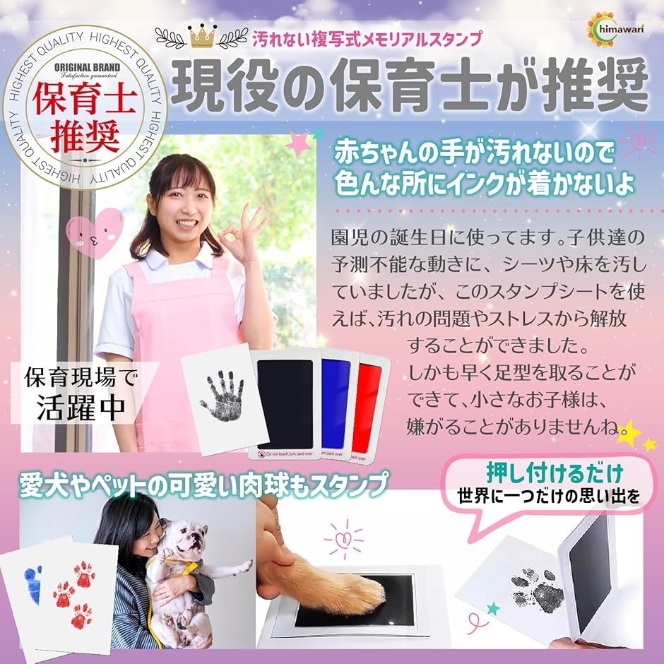 「手が汚れない」特殊用紙を使用する事で手を汚すことなく手形・足形が取れます。