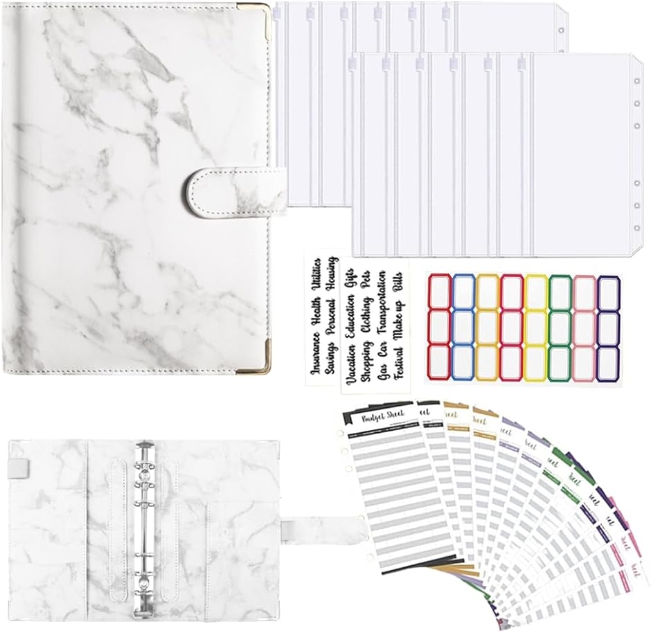 セット内容:ファスナー付きPVC素材のファイル:12枚、予算管理用紙:12枚、英字ステッカー:2枚、カラーシール:1枚の大容量予算バインダー
