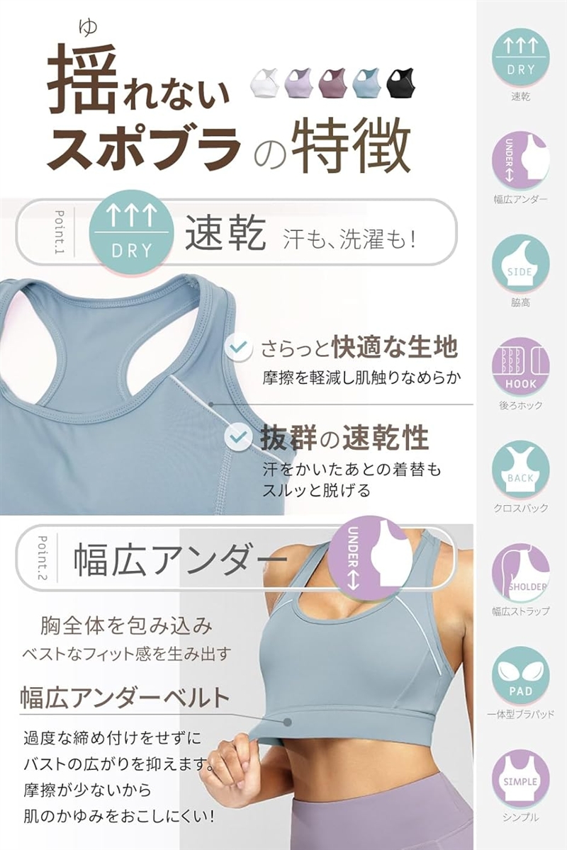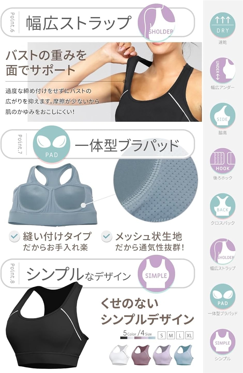 スポーツブラ一体型ブラパッド脇高幅広アンダー後ろホックタイプ(サイズ調節可能)