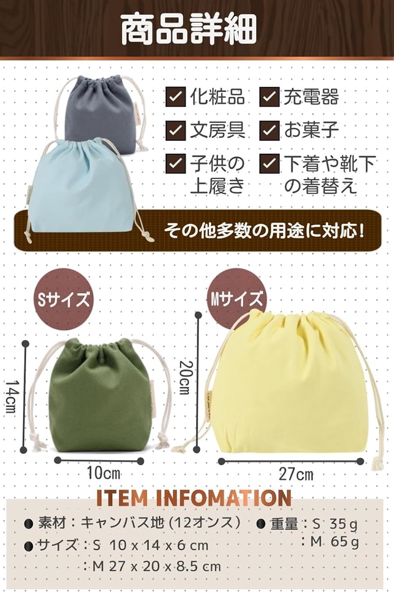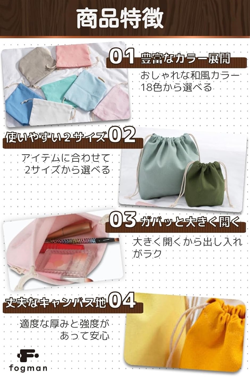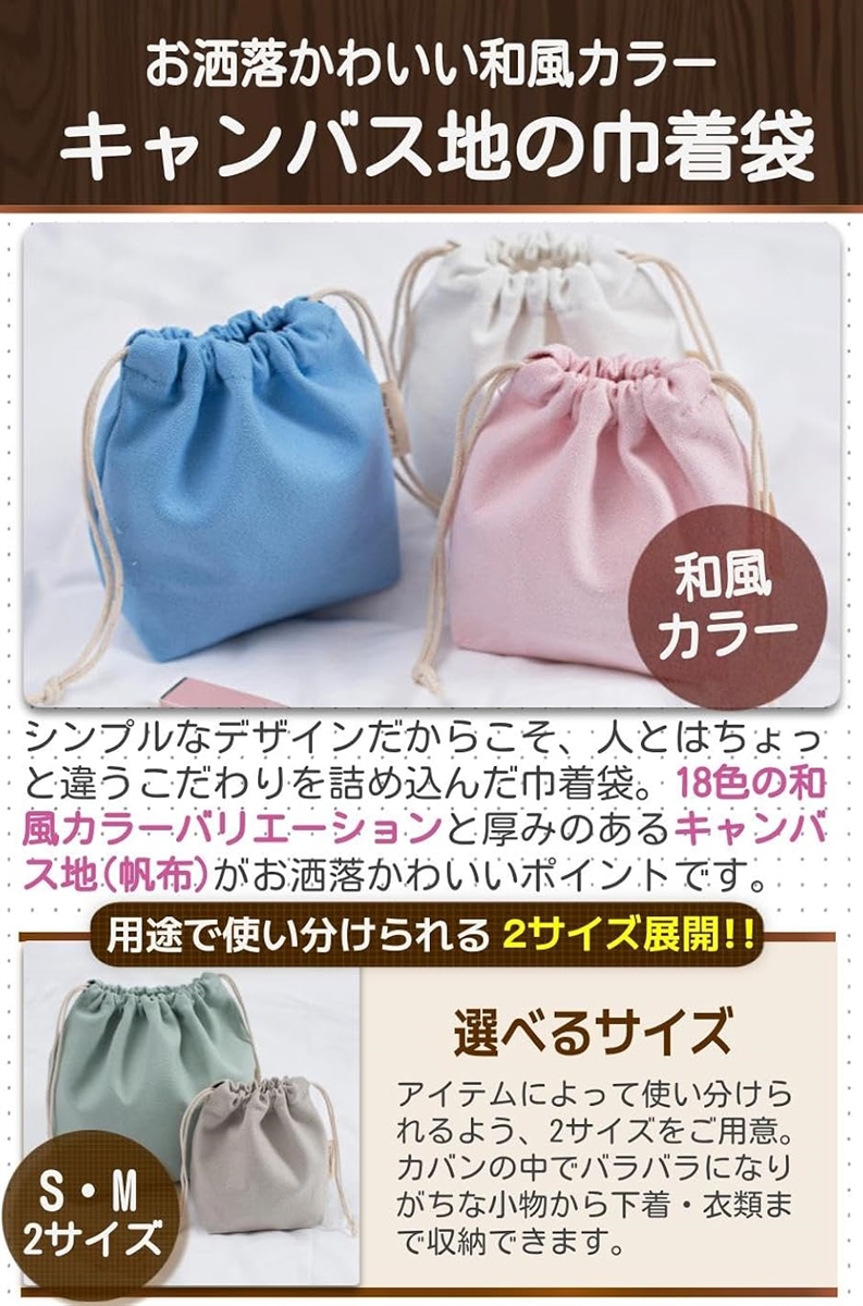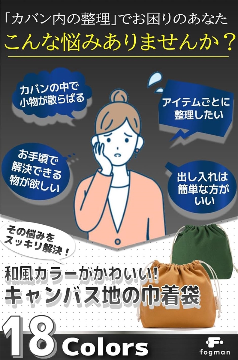 「カバン内の整理」でお困りのあなた こんな悩みありませんか? カバンの中で小物が散らばる…アイテムごとに整理したい… お手頃で解決できる物が欲しい…出し入れは簡単な方がいい… その悩みをスッキリ解決。 和風カラーがかわいい.キャンバス地の巾着袋。