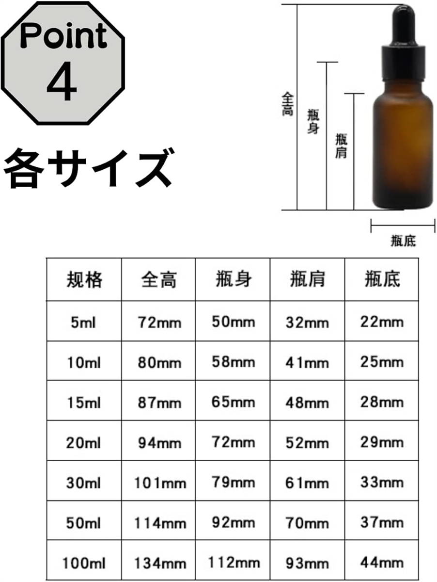 「商品詳細」容量:5ml (ボトル直径22mmxボトル高さ50mm) / 10ml (ボトル直径25mmxボトル高さ58mm) / 15ml (ボトル直径28mmxボトル高さ65mm) / 20ml (ボトル直径29mmxボトル高さ72mm) / 30ml (ボトル直径33mmxボトル高さ79mm)、本体:20本、漏斗(PP製):5個、*色は艶消しのブラウンです。