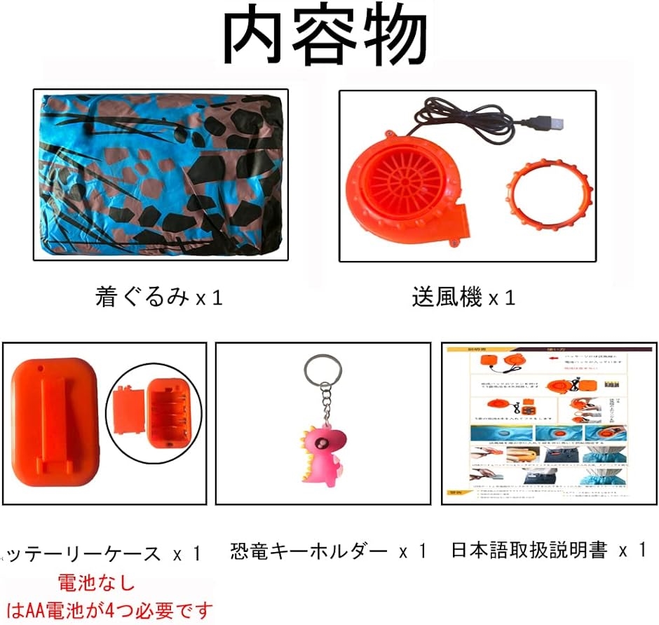 「セット内容」この恐竜の着ぐるみには、衣装、送風機、バッテリーボックス(バッテリーは含まれていません)、恐竜キーホルダー 1点が含まれています