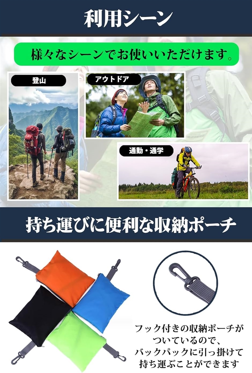 フック付きの収納ポーチが付いて、普段からバックパックに引っ掛けて持ち運ぶことができるので、急な雨でもさっと取り出して使うことができます。