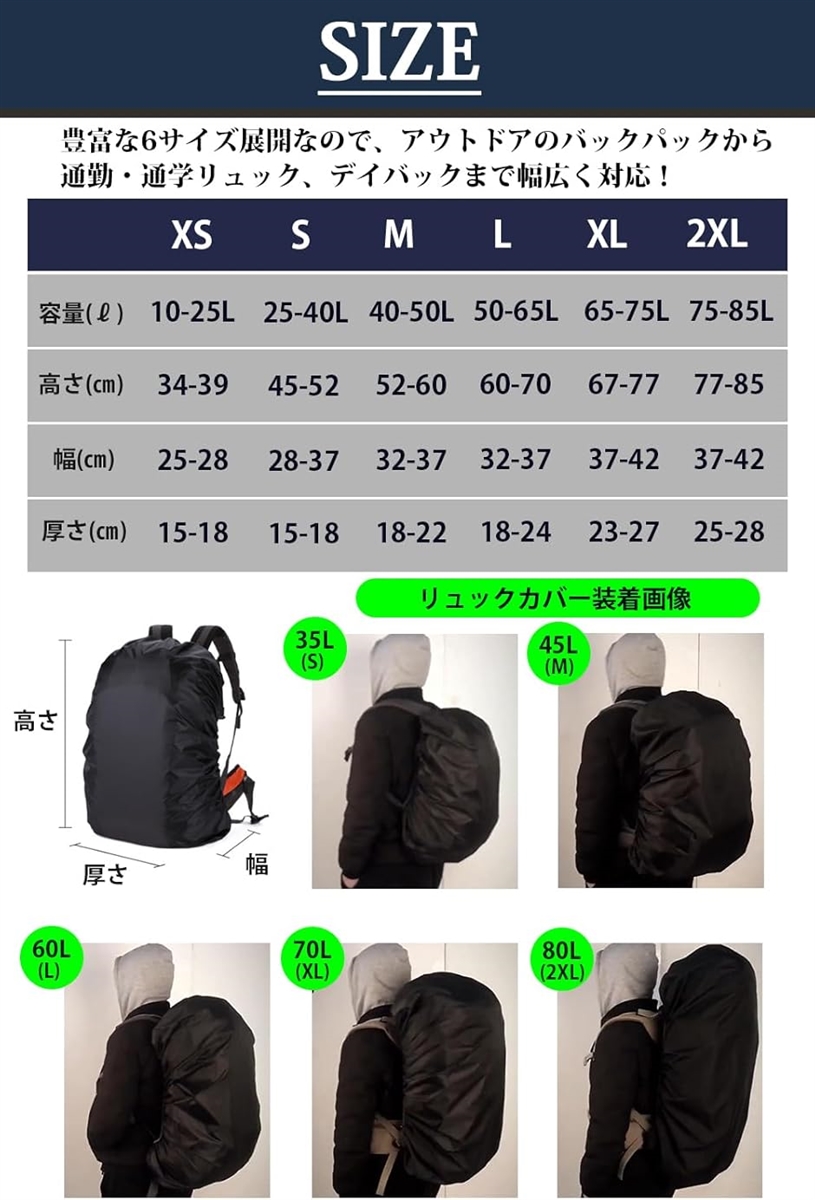「自転車、バイク、アウトドアなど」サイズ豊富な6サイズ展開なので、バックパックやビジネスリュック、デイバック、ランニングバック等々、お手持ちのリュックにぴったりフィット。