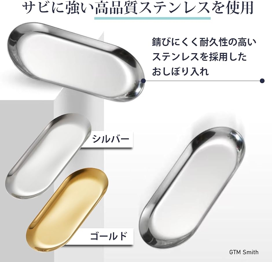 「商品仕様」 (セット内容):おしぼりトレイ5個セット (サイズ):約18cmx8.5cmx1.2cm (カラー):銀・金 (重量):約80g/個 (材質):ステンレス