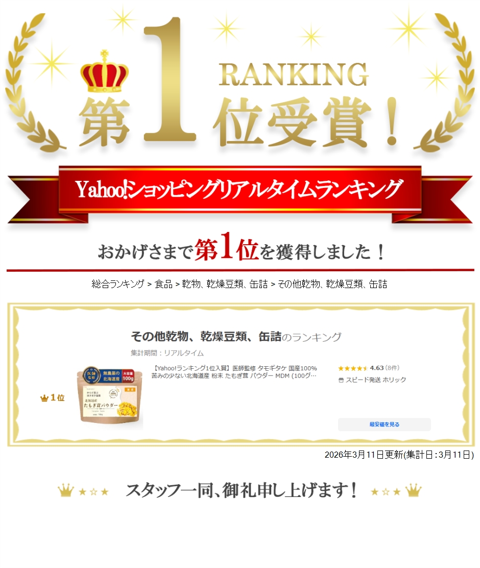 「医師監修の たもぎ茸 パウダー」テレビで話題の注目成分「 エルゴチオネイン 」をはじめとして、β-グルカン、ナイアシンアミドなど、豊富な成分やうまみが含まれております。