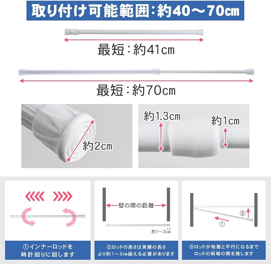| 商品名 | 突っ張り棒 2本 収納棚 スペース拡張 サイズ調整 滑り止め 取り外せる カーテン 40cm-70cm |