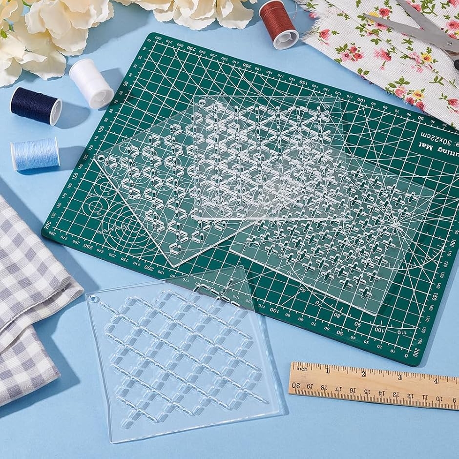 パッケージ内容: 縫製ニーズに合わせて、クロス、菱形、三角形、六角形パターンのアクリルテンプレートを4枚含まれます。