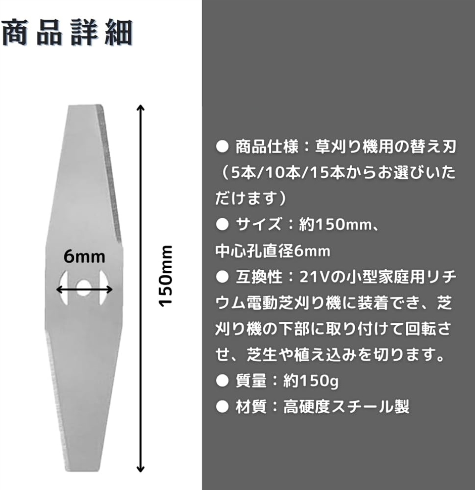 「商品仕様」:草刈り機用の替え刃(5本、10本、15本からお選びいただけます)