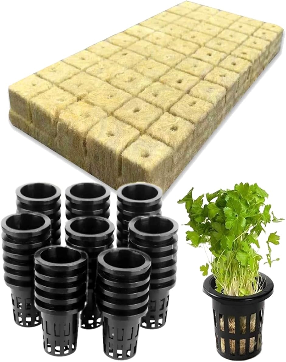 水耕栽培用ロックウールブロックと育苗ポット50個セットです。