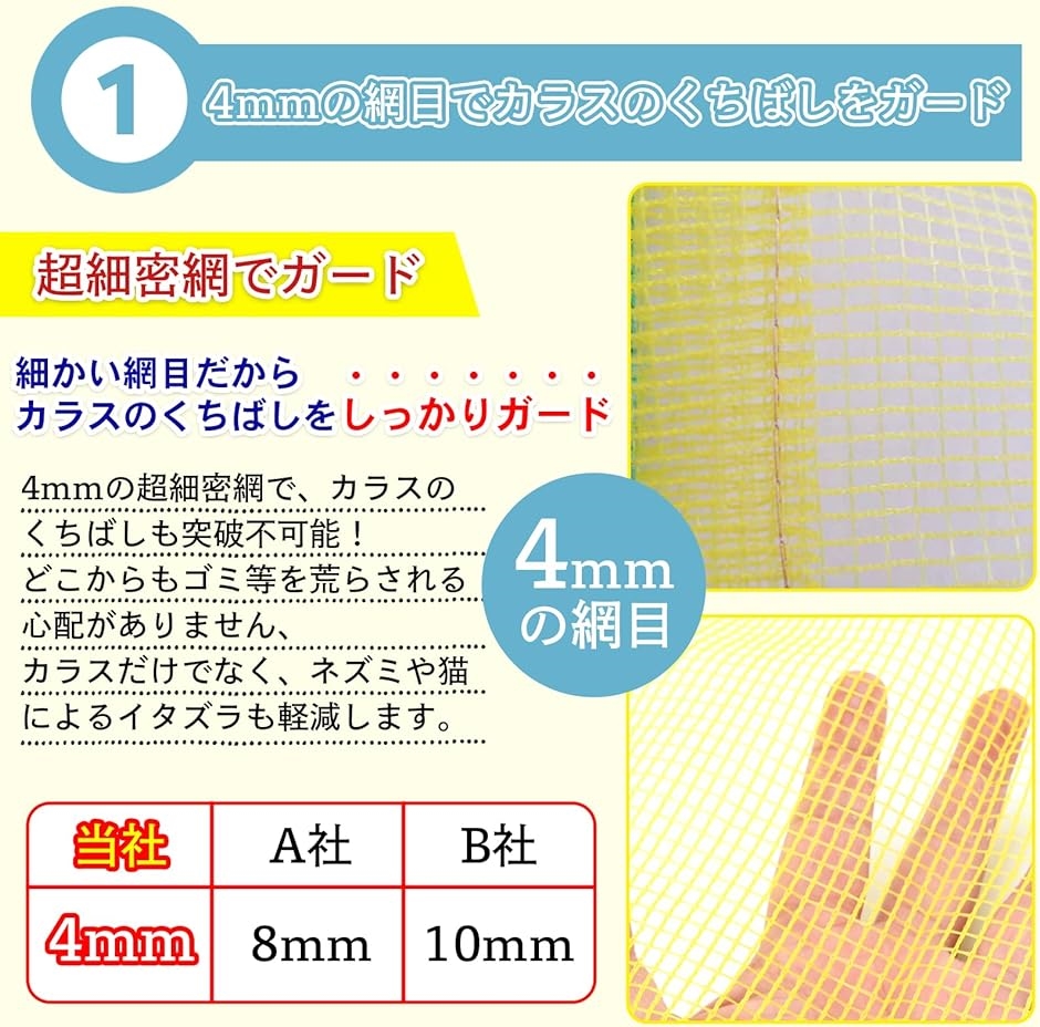 カラスにゴミを荒らさせない。カラス除けゴミネットカラスの知恵も敵わない。4mm超細密網4mmの超細密網で、カラスのくちばしも突破不可能。どんなに賢いカラスも、ゴミを漁ることはできません。