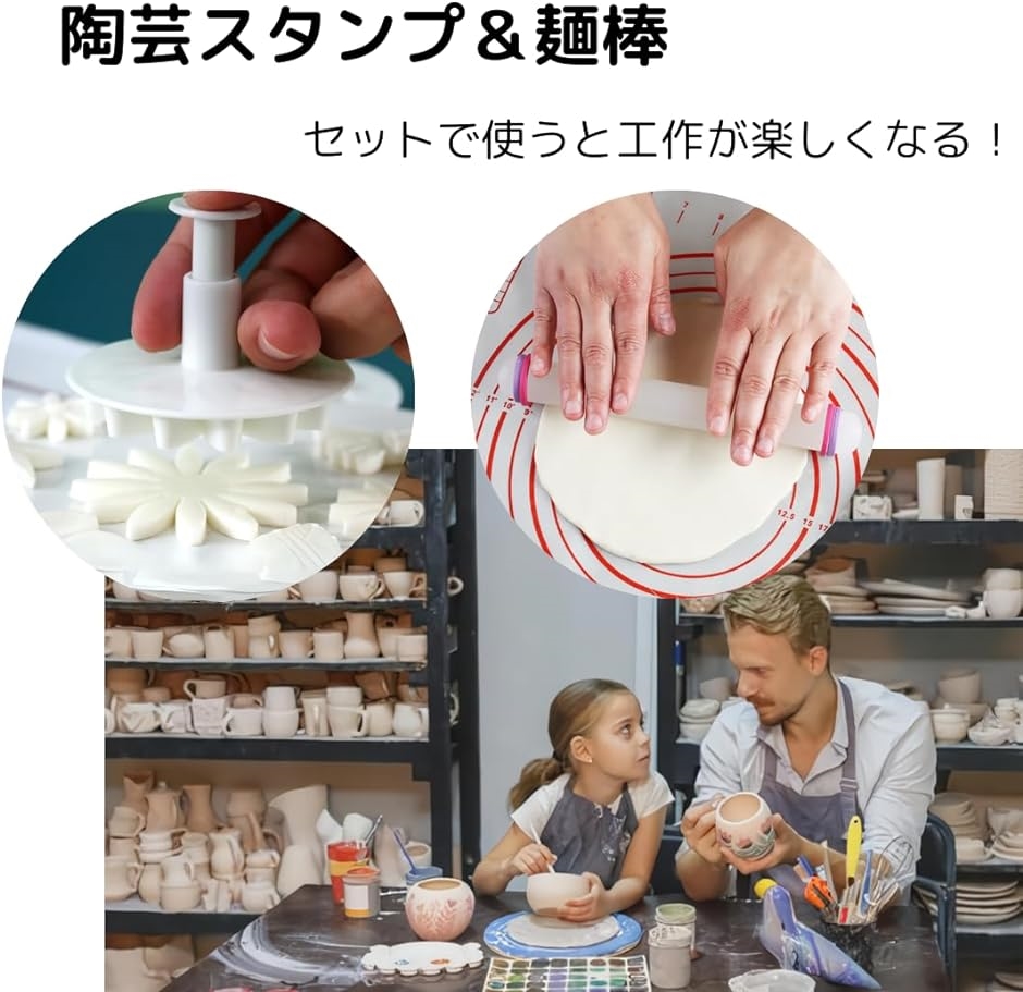 「便利なセット」陶芸や粘土工作で大活躍する陶芸スタンプ(抜き型)と麺棒(のし棒)のセットです。