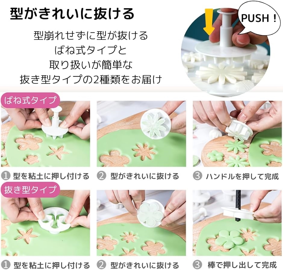 「使いやすい」粘土スタンプは手で押して型を抜くタイプとスプリングで抜くタイプの2種類。