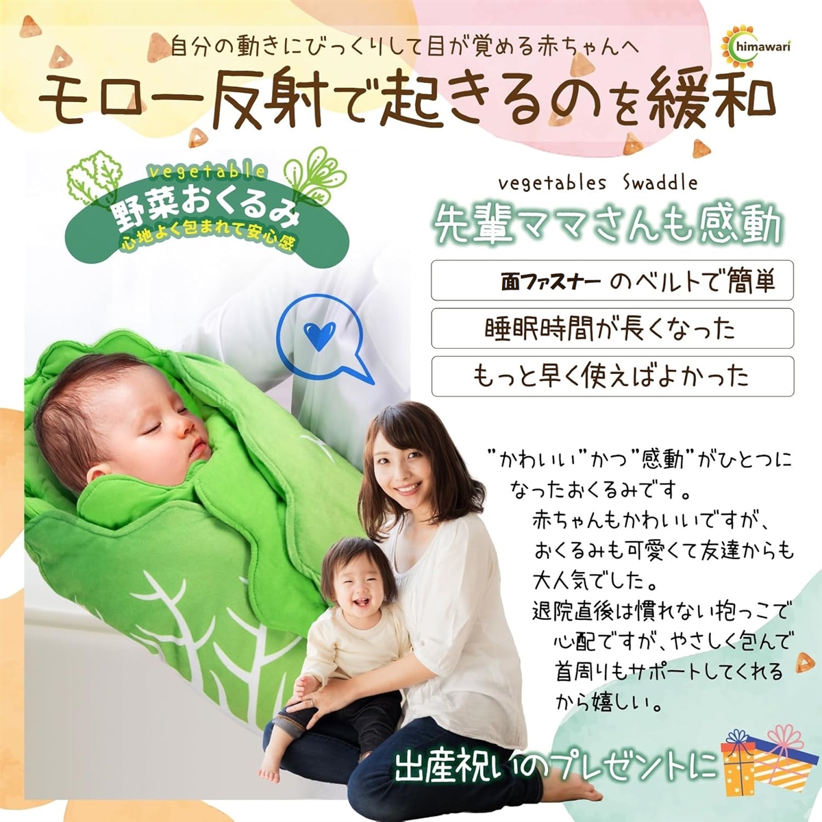 「モロー反射を緩和」赤ちゃんは寝ている時に自分の動きにびっくりして目がさめます。