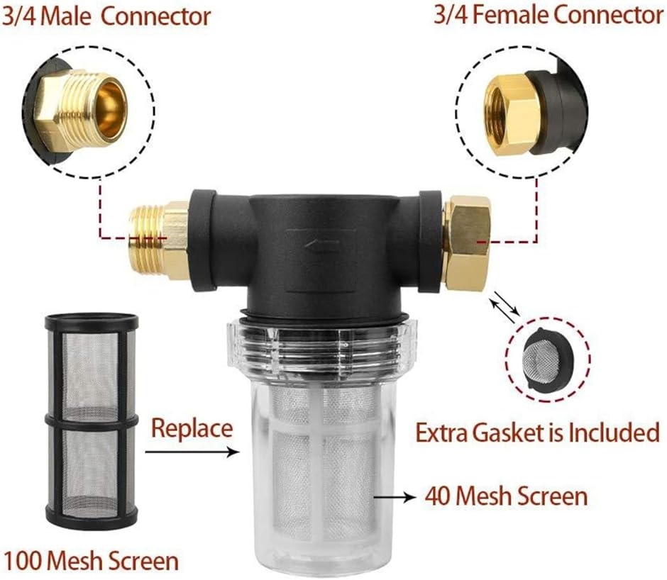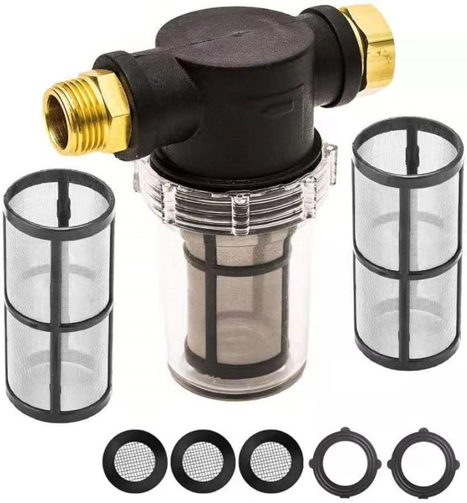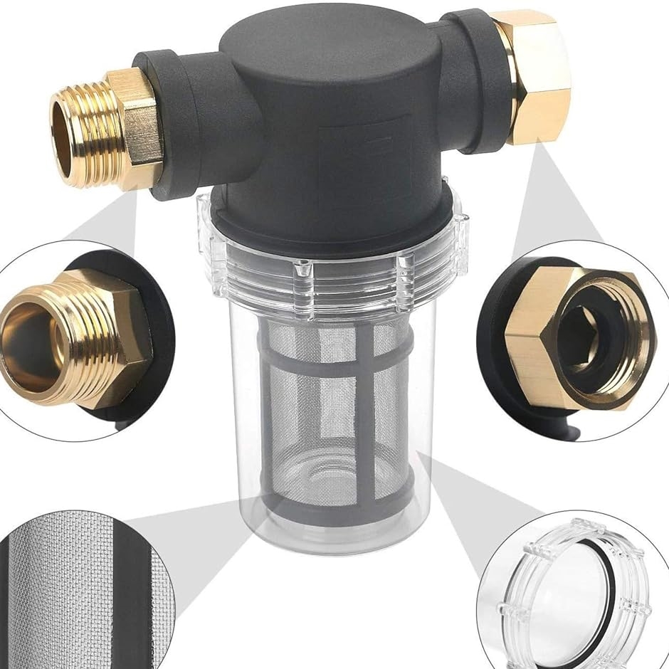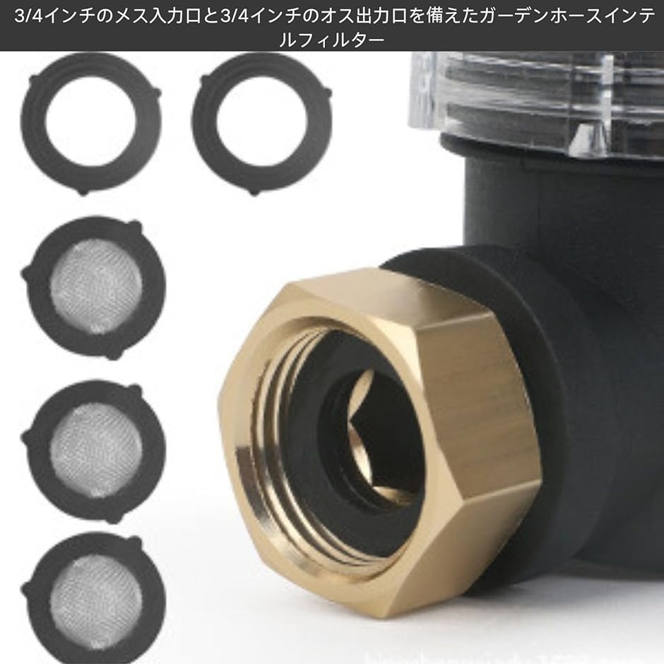 1. 「理想のサイズ」: 3/4インチのメス入力口と3/4インチのオス出力口を備えたガーデンホースインテルフィルター。