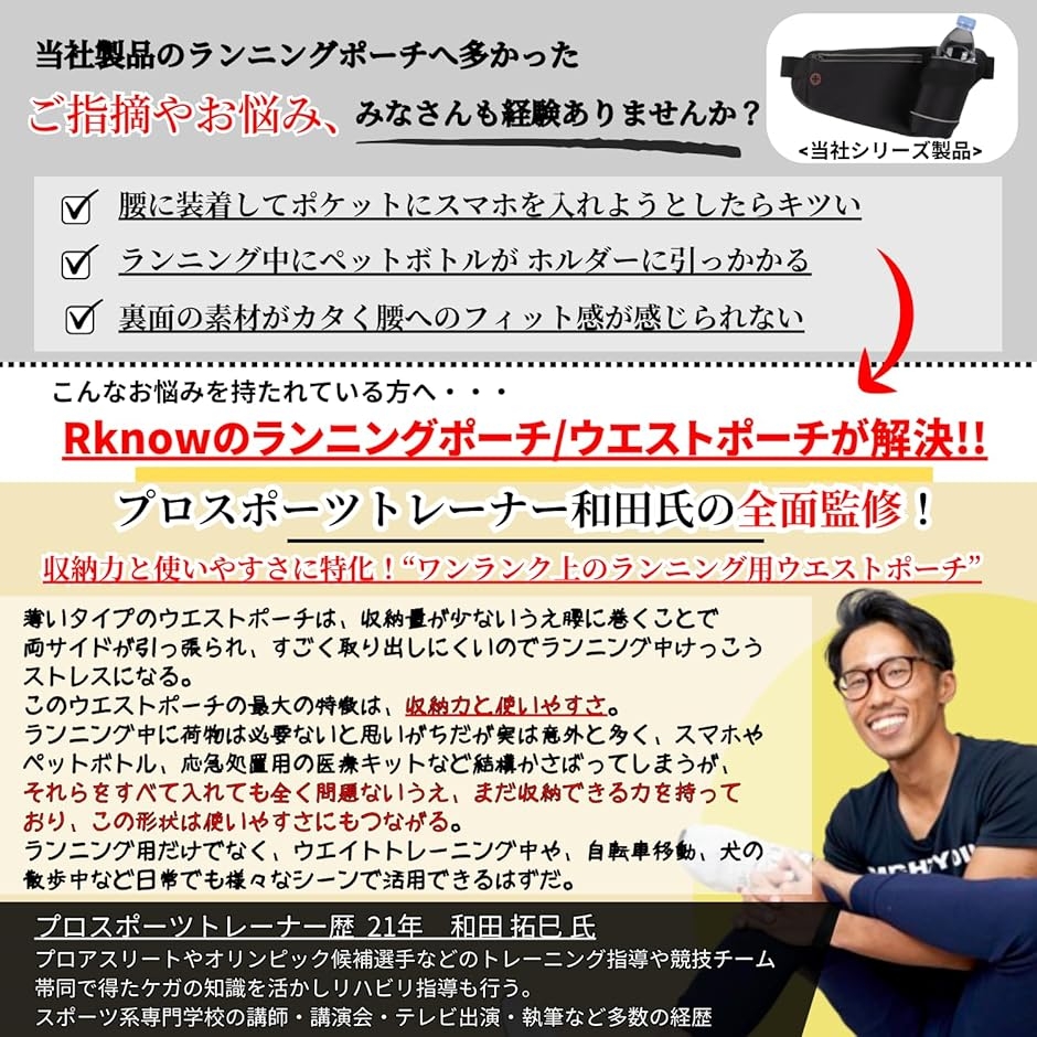 「プロスポーツトレーナー全面監修」オリンピック候補選手やアスリートのトレーニング指導やリハビリ指導、テレビ出演や講師などのキャリア歴21年の和田拓巳氏全面監修のもと、ビギナーからベテランランナー、ジョギングやウォーキング愛好者の方々と試行錯誤を重ねて共同開発したRknowブランドのランニングポーチ/ウエストポーチ登場。。。