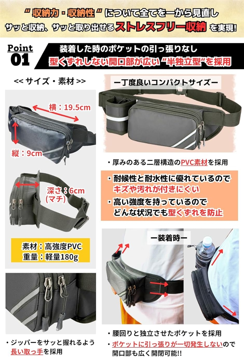 また、高強度PVC素材により、型くずれせずポケットが引っ張られないので、深さ(マチ)が6cmもあり開口部が広く全機種スマホサイズもサッと収納・サッと取り出し可能です。