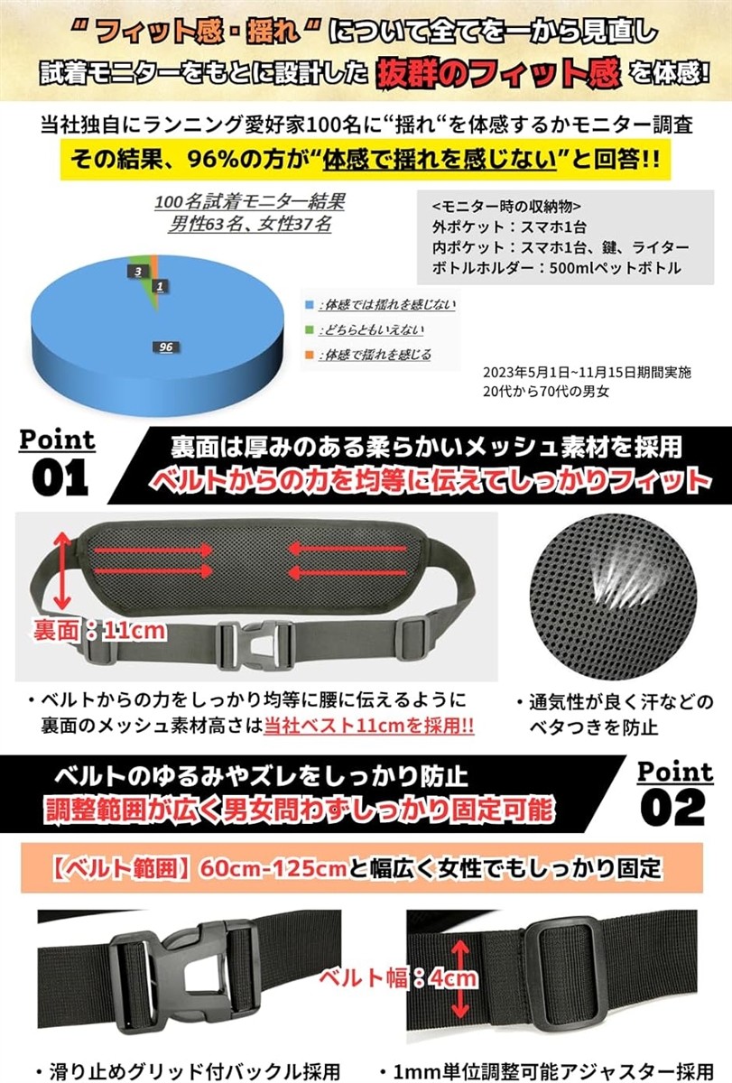 「揺れない・ズレない設計」裏面のメッシュ素材高さを11cmにすることでベルトからの力を均等に伝えて体にピタッと密着。。。