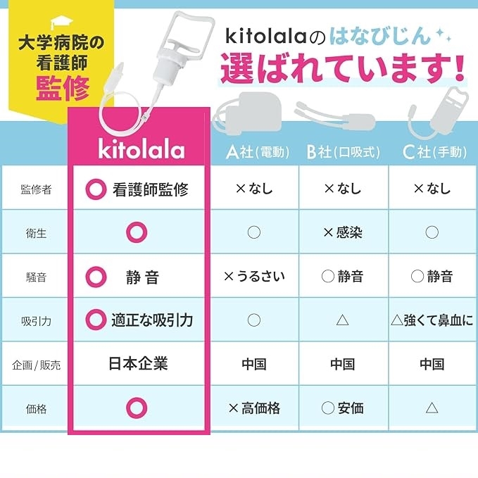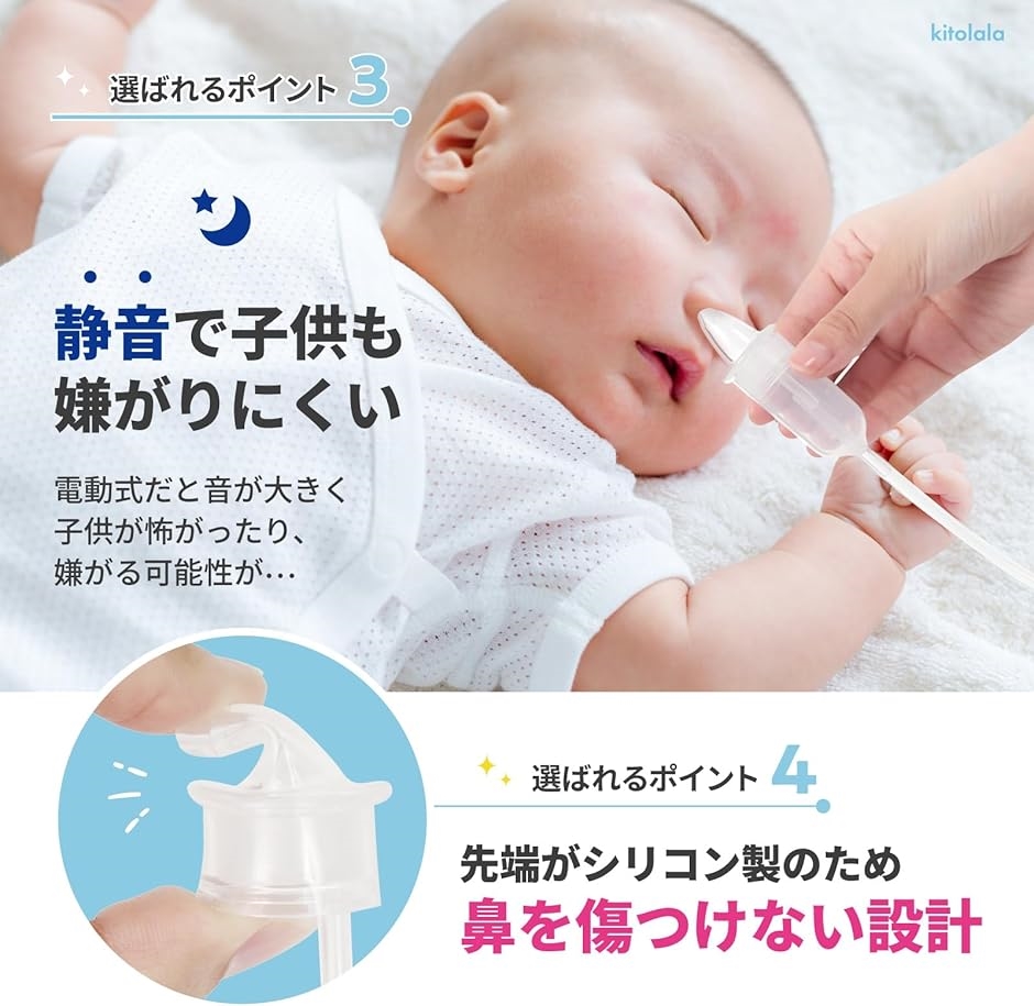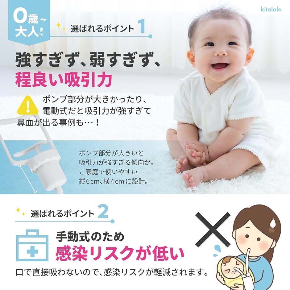 強すぎず、弱すぎず、程良い吸引力*手動式のため口吸い式に比べ感染リスクが低い* 鼻汁をそのままにしておくと、ウイルスや細菌が体内に侵入して、体に悪影響を及ぼすリスクがあるため鼻水吸引はとても重要です。