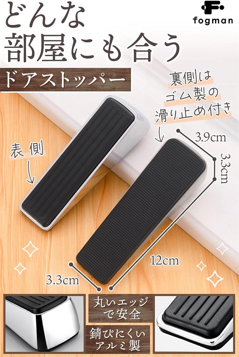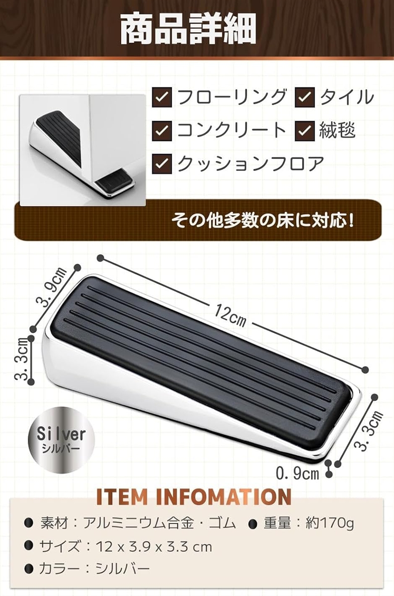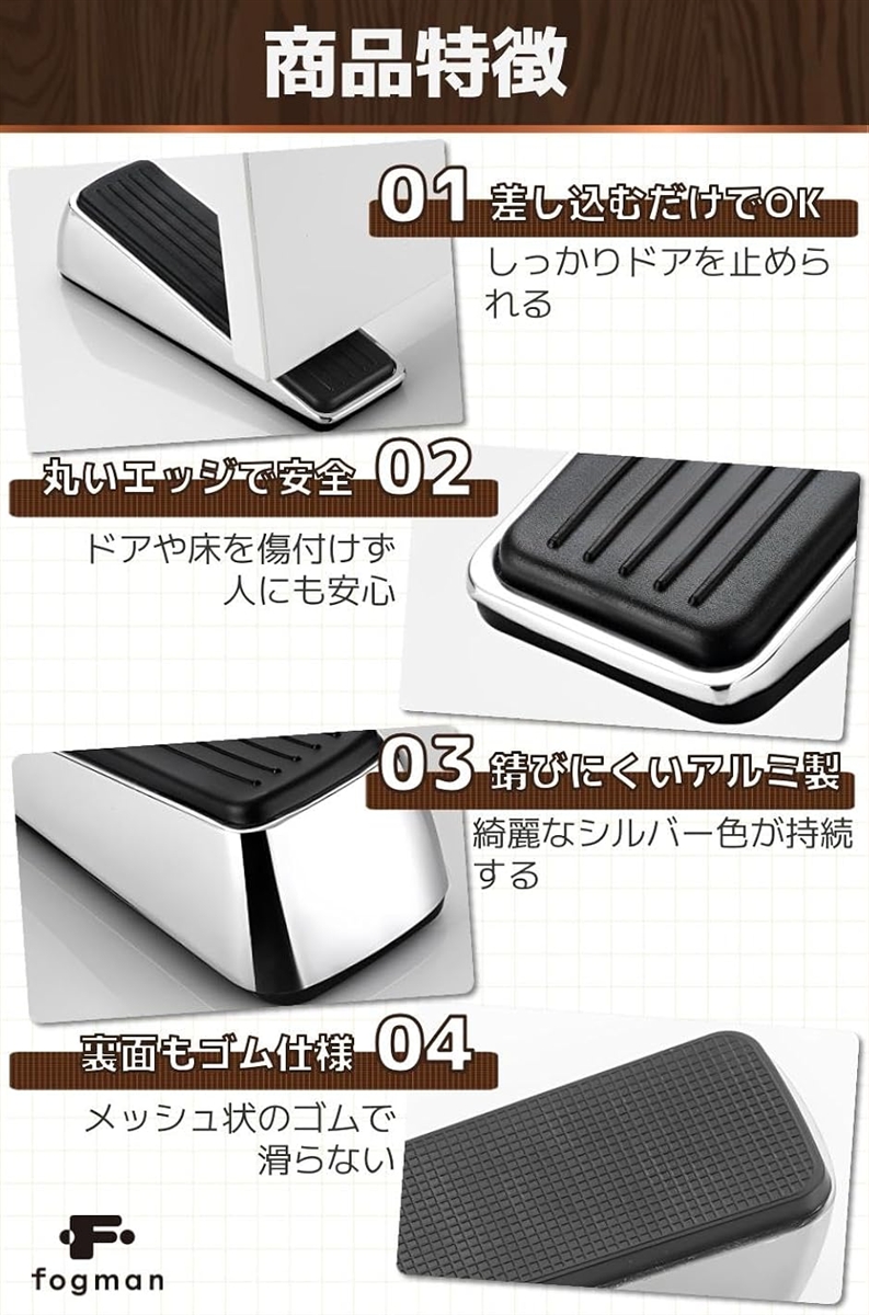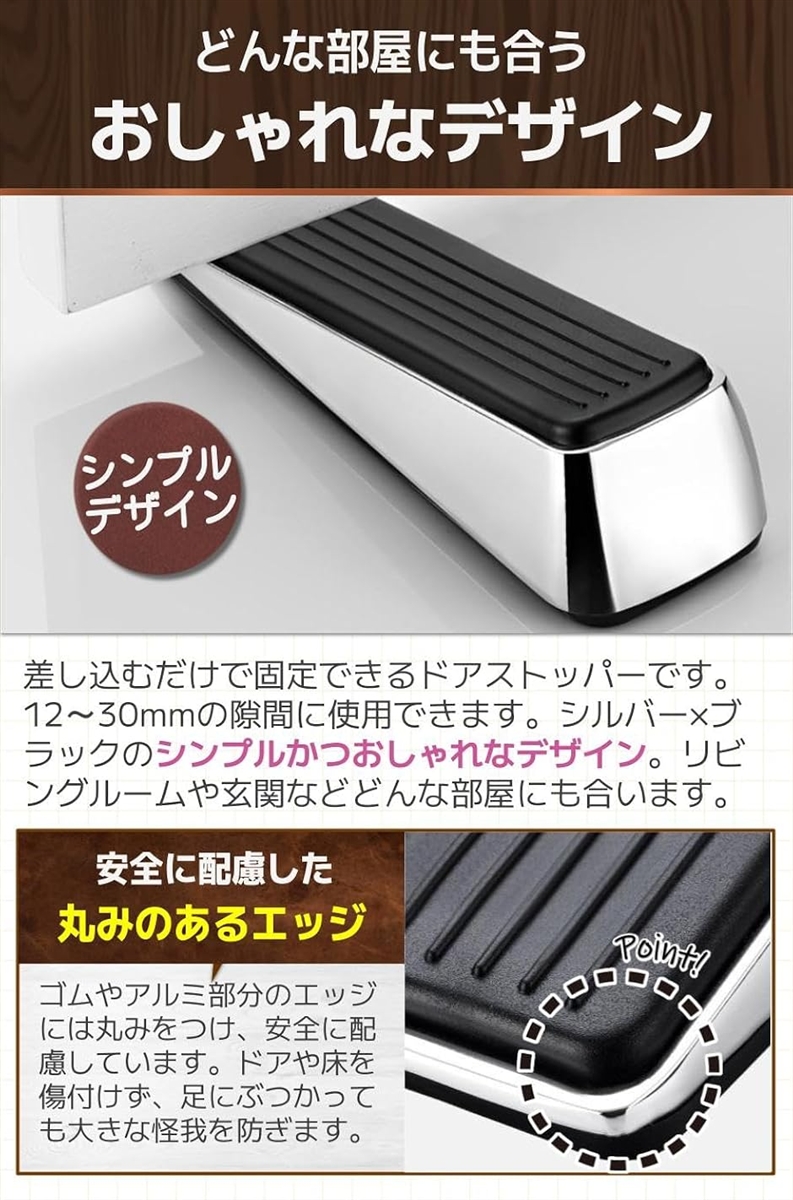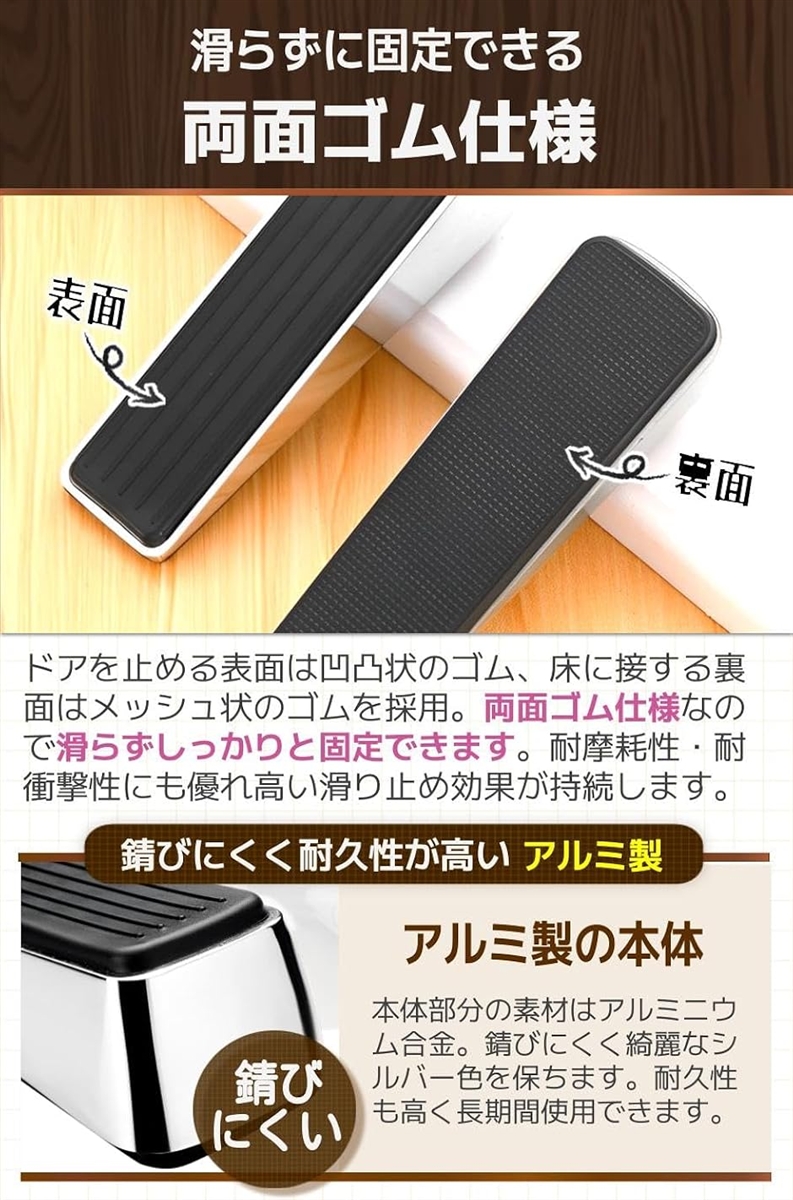 「商品特徴」(1)差し込むだけでOK:しっかりドアを止められる/(2)丸いエッジで安全:ドアや床を傷付けず人にも安心/(3)錆びにくいアルミ製:綺麗なシルバー色が持続する/(4)裏面もゴム仕様:メッシュ状のゴムで滑らない