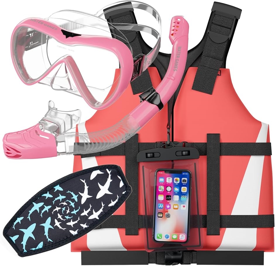 v・「スリムで動きやすいマリンベスト+シュノーケルセット」動きやすいスリムでスマートなフローティングベストとマスク、シュノーケルの嬉しい組み合わせセットです。