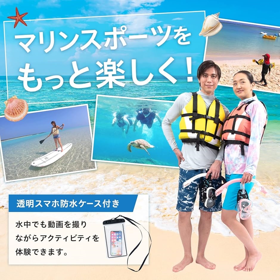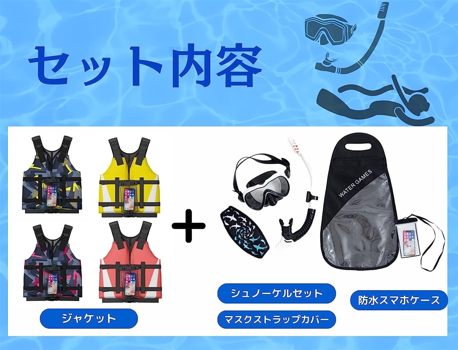 | 商品名 | シュノーケル・マスク・ライフベスト3点セット 防水スマホケース マスクのストラップカバー付き Oセット |