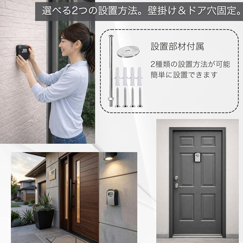 「2WAYの簡単設置」 壁掛け用のアンカーネジセットに加え、ドアの覗き窓を利用する特殊ボルトも同梱。