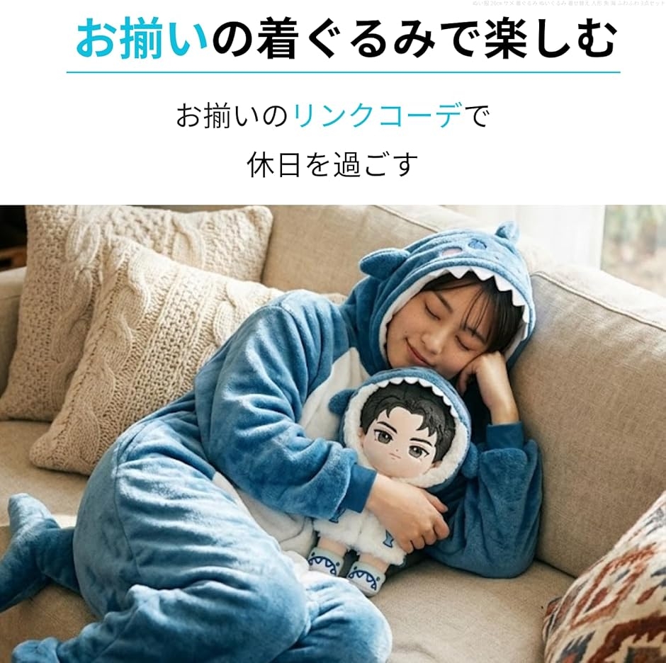 持ち主様も同じようなサメの着ぐるみを着用すれば、大切なぬいぐるみと一緒にお揃いの「リンクコーデ」を楽しむことができます。