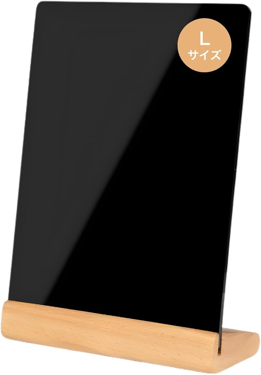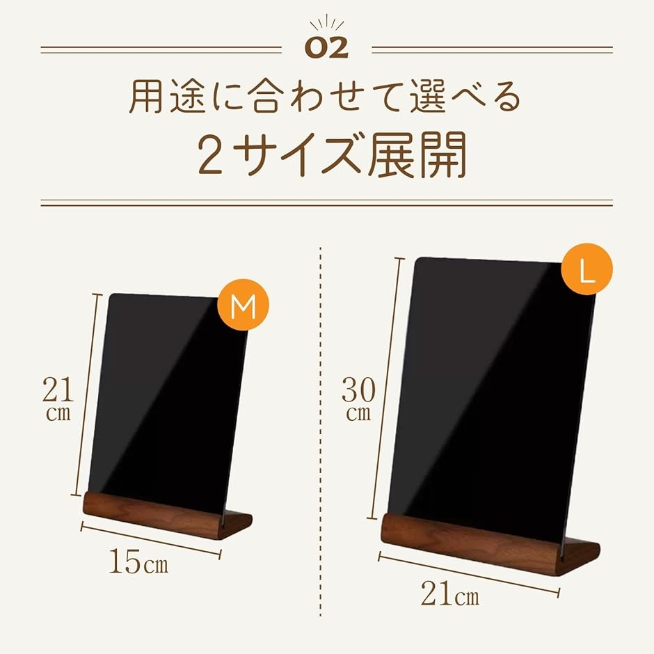 Lサイズ(約297x210mm)とMサイズ(約210x150mm)の2つの使いやすい大きさで、メニューや本日のおすすめ、受付案内、イベント案内など幅広く活躍します。