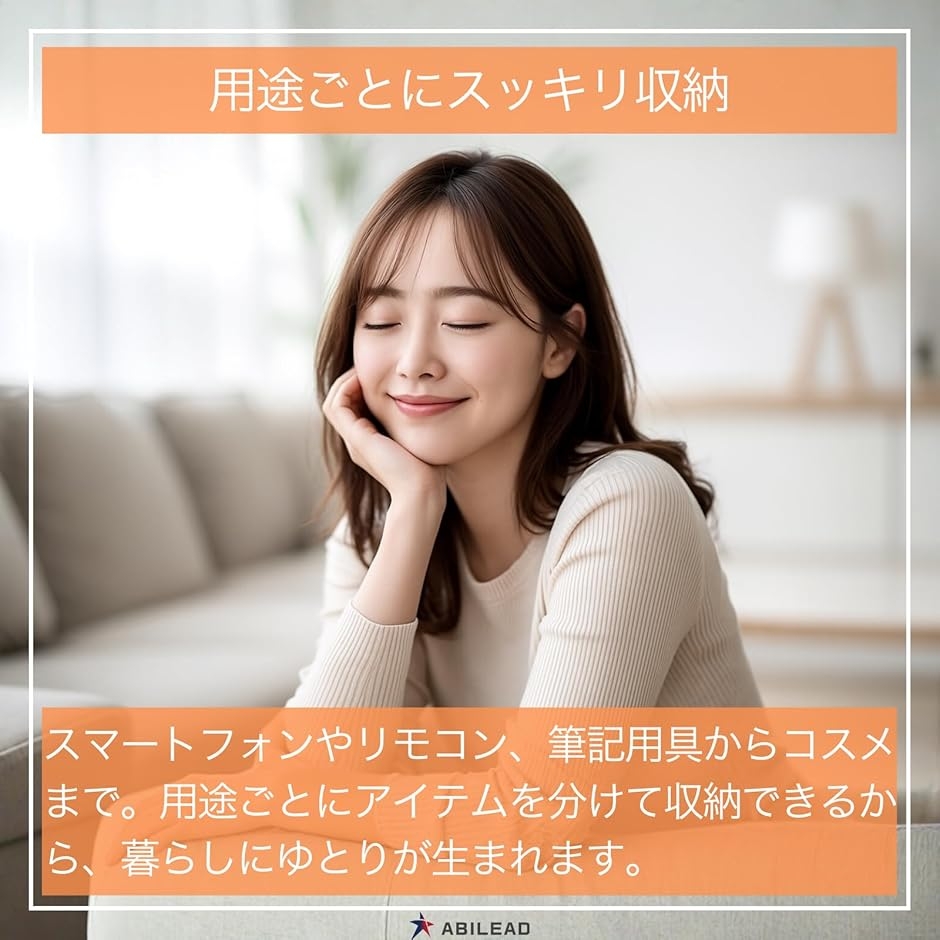 「使い方のアイデア」手前はペン立てやリモコンの定位置に、中段はスマホやメガネに、奥はコスメやメモ帳に。