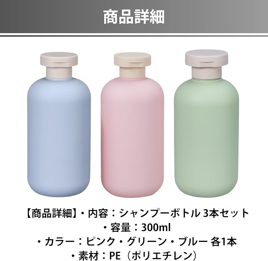 「商品詳細」・内容:シャンプーボトル 3本セット ・容量:300ml ・カラー:ピンク・グリーン・ブルー 各1本 ・素材:PE(ポリエチレン)
