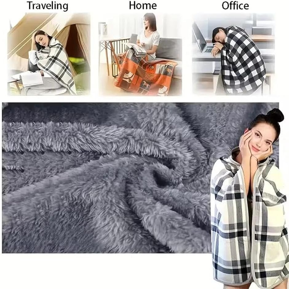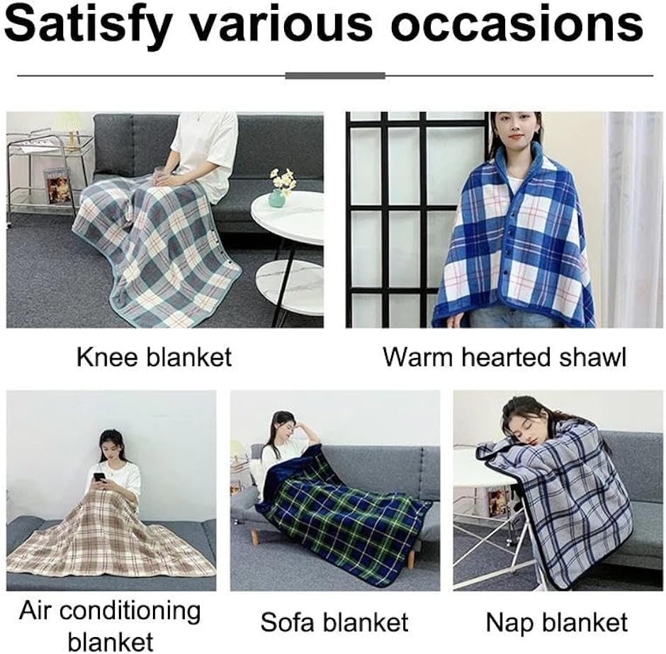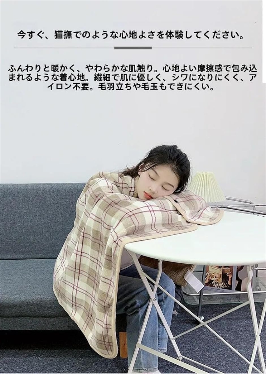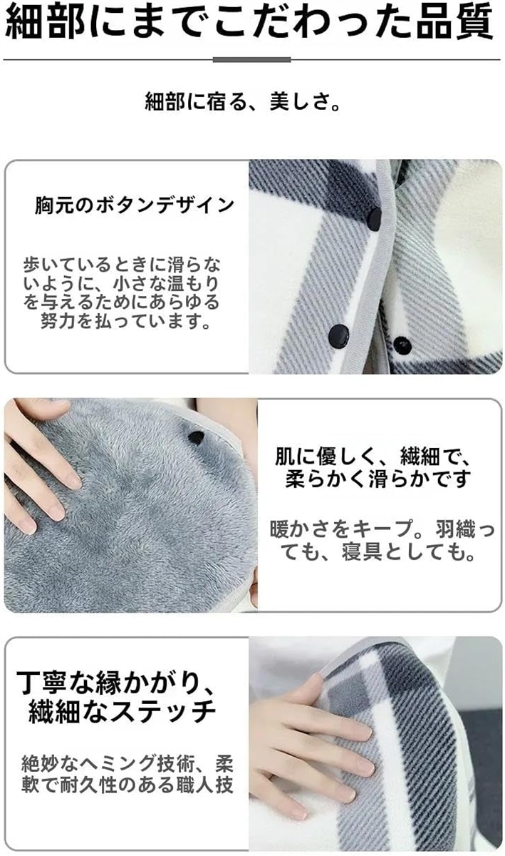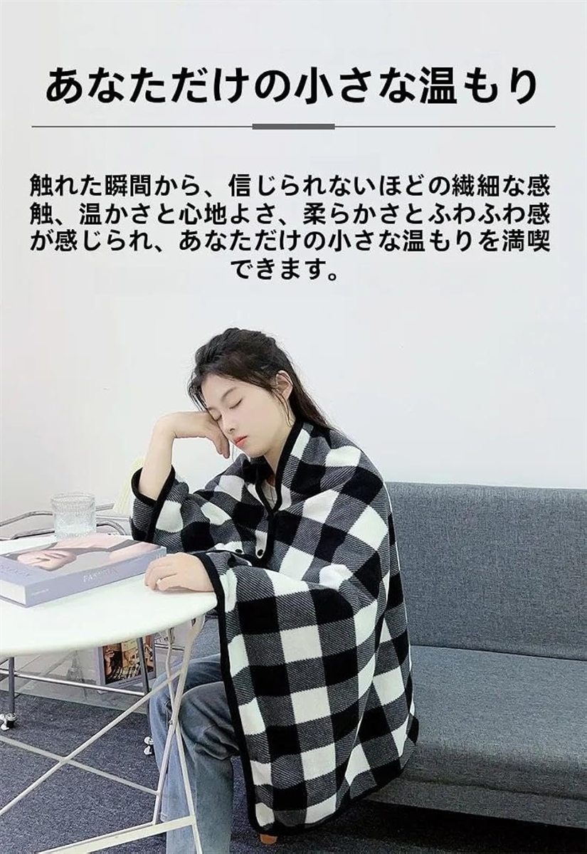 「主な特徴」 ・両面ふわふわフリース素材 ・軽量で暖かい防寒設計 ・スナップボタンで前を留められる ・羽織る/掛ける/巻くの3WAY ・洗濯機で洗えて衛生的 ・性別問わず使えるユニセックスデザイン チェック柄、無地ネイビーなど落ち着いたカラー展開で、リビングやオフィスでも使いやすい一枚です。