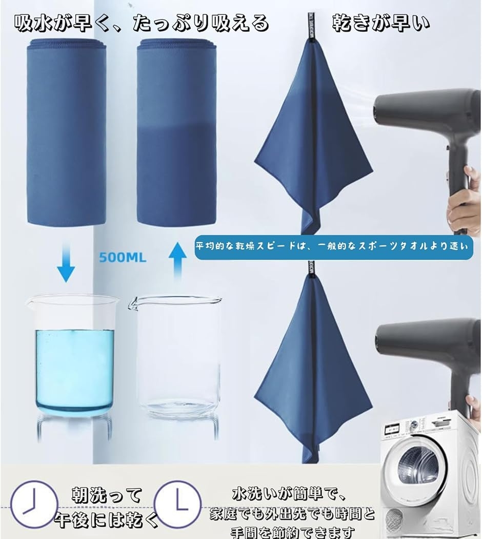 「強力な吸水性と速乾性」吸水タオル 通常のタオルよりこのマイクロファイバー タオルは3〜5倍の水分を素早く吸収できて、乾燥速度はほかの速乾タオルより速いです.そのため、スポーツタオル、フェイスタオル、プール タオル、ジムタオル、スイミングタオルやバスタオルとしても使用できます.