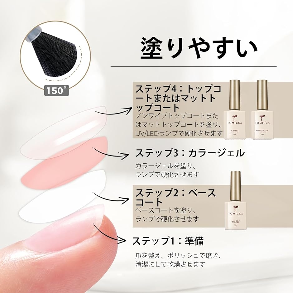 「ヒント」ベースコート硬化後に少しべたつきますが、これは正常であり、硬化後は通常のジェルと同様、未硬化ジェルを拭き取らずにそのままカラー等を塗布してお使いください。