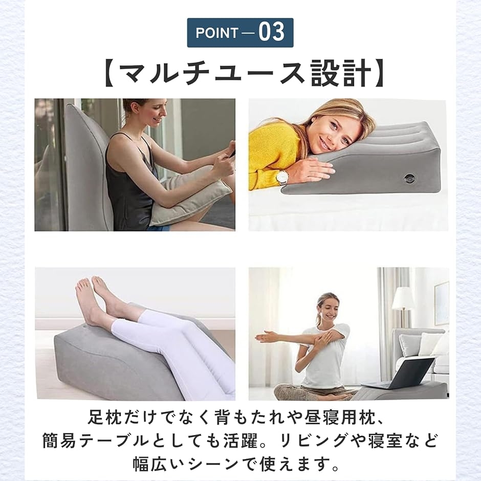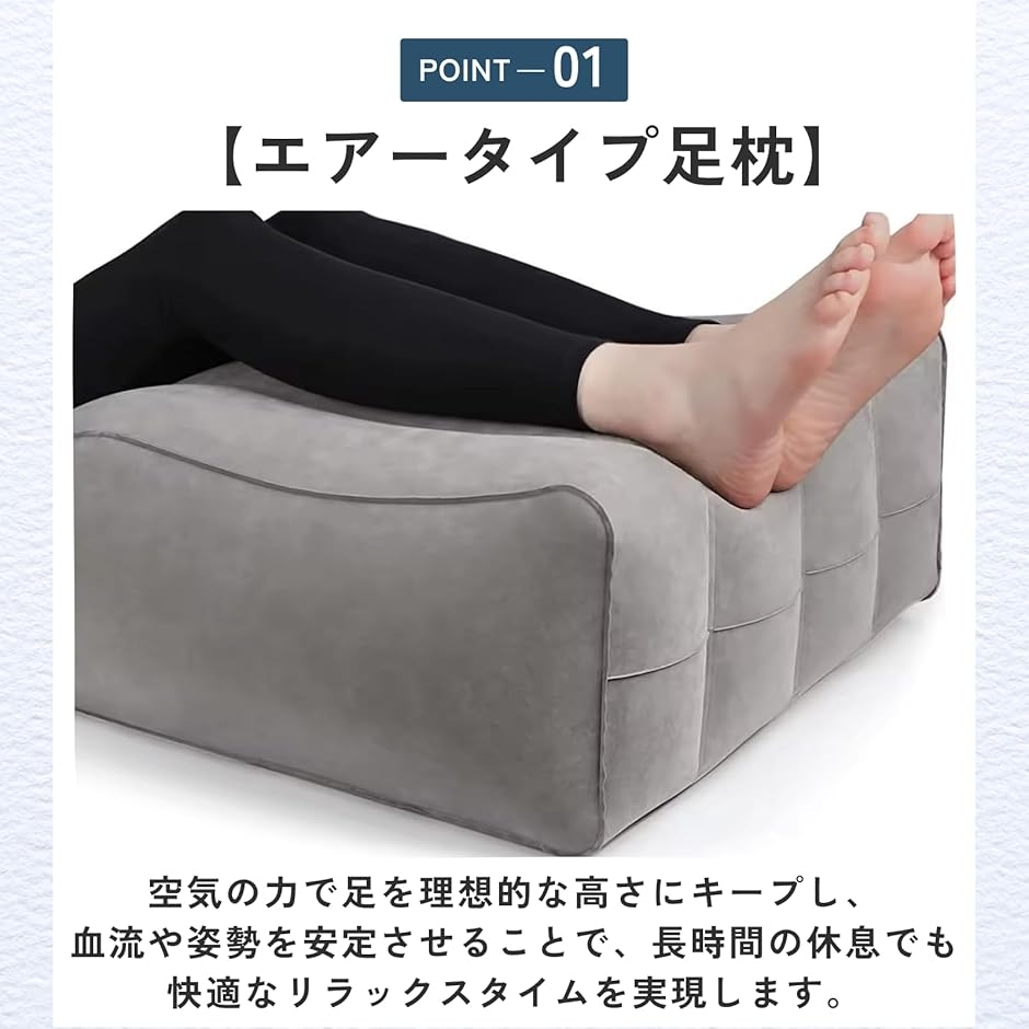 「エアータイプ足枕」空気の力で足を理想的な高さにキープし、血流や姿勢を安定させることで、長時間の休息でも快適なリラックスタイムを実現します。