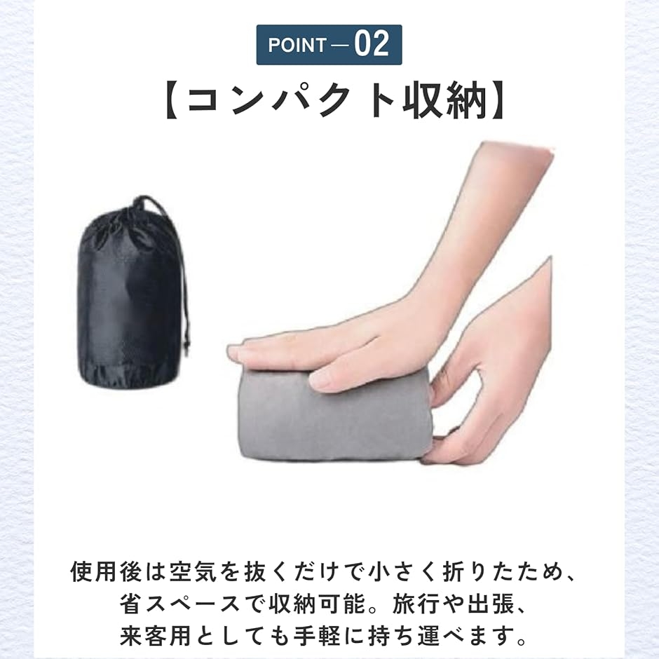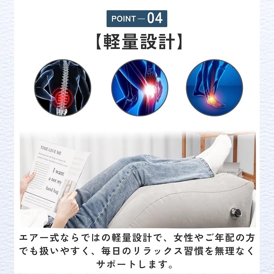 「軽量設計」エアー式ならではの軽量設計で、女性やご年配の方でも扱いやすく、毎日のリラックス習慣を無理なくサポートします。