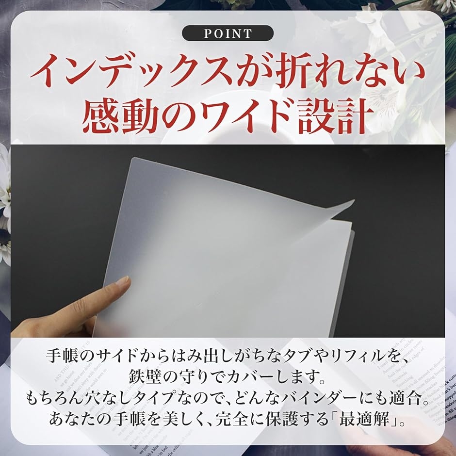 「インデックスまではみ出さない「正解」サイズ」「せっかくの表紙なのに、インデックスが飛び出して折れてしまった…」そんな経験はありませんか?本製品は、一般的な規格よりも横幅を広げたxx「ワイド設計」xxのプラスチックシートです。