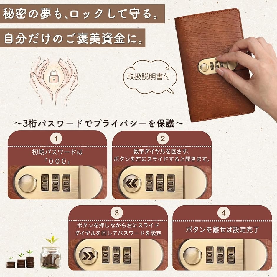 「こっそり貯める、安心のプライバシー保護」 3桁の暗証番号でロックできる(取扱説明書付)ので、家族に見られたくない「秘密のご褒美貯金」や「推し活資金」も安全に保管。
