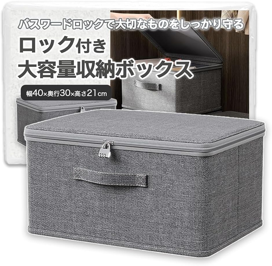 「商品詳細」大容量ロック付き収納ボックス サイズ:40x30x21cm 素材:高品質不織布+スチールフレーム 仕様:折りたたみ式・パスワードロック付き・持ち手2箇所 カラー:グレー *暗証番号を忘れると初期設定に戻すことはできませんのでご注意ください